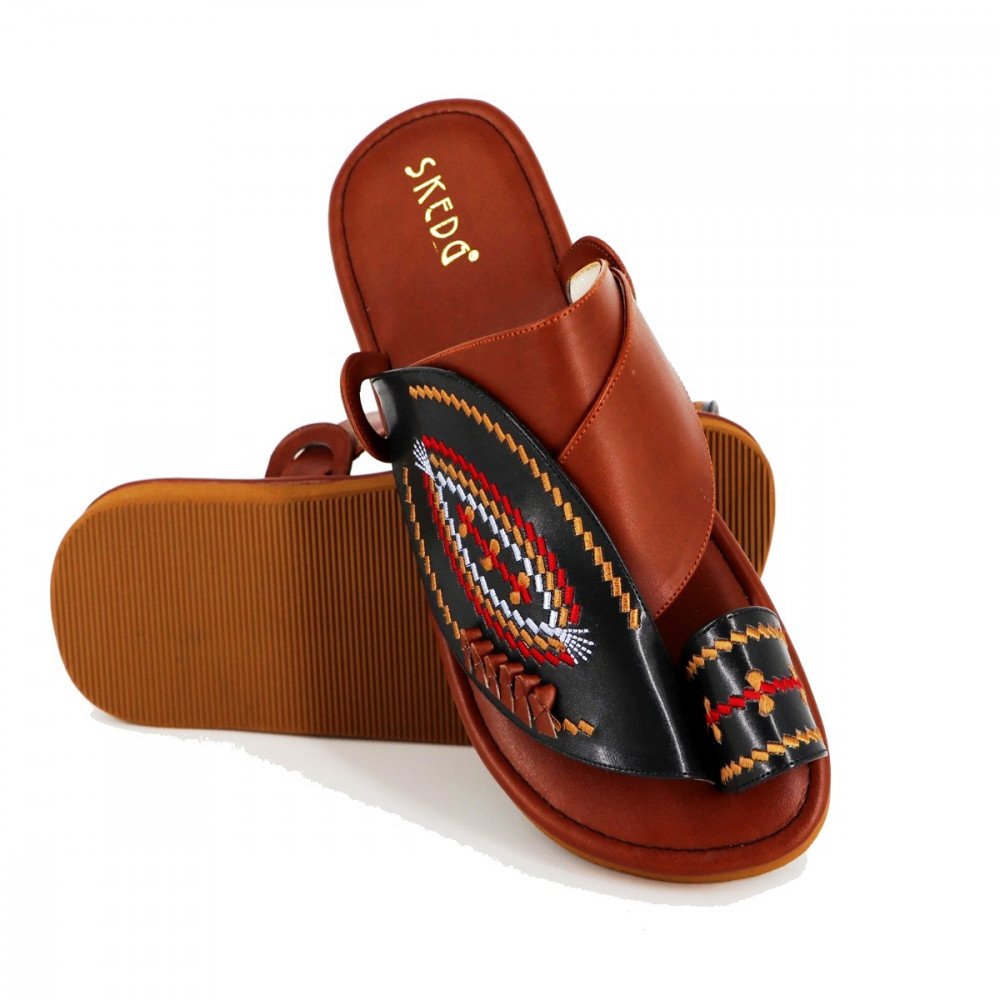 -تصميم تراثي فاخر باللون البني مع تطريز ملون يعكس الطابع التقليدي.